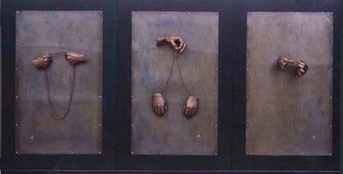 bronze, oak, copper plate, steel chain, 120 x 240 cm, 1999