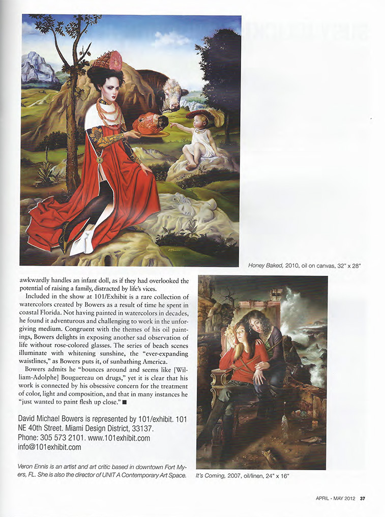 In 1991, David began his illustration career working mostly with book publishers in New York City in which he completed over one hundred book covers in the span of over ten years. Also, David's work graced the cover of numerous prominent magazines, including TIME. He also painted the portrait of J. P. Morgan for the cover of Cigar Aficionado , as well as the family portrait of the Rothschild family and the Chateau Latour Winery for the covers of Wine Spectator magazines. These paintings are now part of the publishing company's permanent collection at their corporate headquarters in NYC. Bowers's illustrations received numerous awards including three Joseph Morgan Henniger Awards, "Best of Show" from the Society of Illustrators of Los Angeles along with two Patrick Nagel awards. These awards recognized David with the best, published illustration of the year. Also, David received nine other medals recognizing his work from that organization. David also received numerous medals and Merit awards from the Society of Illustrators in New York, Spectrum and Communications Arts Magazine. As David transitioned into Fine Art, his work continues to be recognized by various organizations including the "Best of Show" from the American Society of Traditional Artists in 2014 and Best of Show from the International Guild of Realism, the "Jack Buncher Award" from the Carnegie Museum of Art in 2013, the "Best of Show" in 2011, "The Best Tromp L'oeil" in 2010 and "Pioneer in Realism" award in 2009 from the International Guild of Realism. David was recognized by The Art Renewal Center with the "Chairman's Choice Award" in 2013 along with the "Staff Award" in 2011 and in 2009 recognized as a "Living Master." David's painting titled, "Made In America" received the 1st place award from The Portrait Society of America in 2011 & 2014. Bowers was a semi-finalist for the Outwin Boochever Portrait Competition in 2009, National Portrait Gallery, Smithsonian Institution. Bowers has had exhibitions across America and Europe, including the Mendenhall Gallery in Pasadena, CA, Gallerie 224 in Laguna Beach, CA, Klaudia Marr Gallery in Santa Fe, New Mexico, 101 Exhibit in Miami, FL and Los Angeles, CA. Gallery Brusen in Denmark, Halcyon Gallery in London, England, Marcel Salome Gallery in The Netherlands and Germany, the Butler Institute of American Art, The Westmoreland Museum of American Art and is currently being represented by Palm Avenue Fine Art in Sarasota, FL, Gallery 126 in Denver,CO and The Winfield Gallery in Carmel, CA. Upon first glance, Bowers' works seems to take you back to periods of painting long gone. This is due to Bowers method of painting, which is reminiscent of the Old Masters, specifically the 17th Century Dutch. David has studied the masters for many years to develop his techniques, which involves multiple layers of paint called glazing and alla prima. The technique might be old, but his paintings incorporate modern themes and current symbolism, which he describes as "realism with an edge." Bowers' paintings are in many private collections throughout the United States and Europe as well as The Museum of American Illustration in New York and the National Portrait Gallery in Washington, DC. Bowers lives in Madeira Beach, FL with his wife Kimberlie, where he paints very meticulously and methodically day in and day out. Awards and Accomplishments2017 "Pioneer of Realism' International Guild of Realism at the Winfield Gallery in Carmel, CA 2016 "Best of Show" International Guild of Realism exhibition at Gallery 1261 in Denver, CO 2014 "Best of Show" International Guild of Realism exhibition at Robert Lange Studios in Charleston, SC 2014 "Best of Show" American Society of Traditional Artists 2013 ARC International Salon Competition, Chairman's Choice Award for the painting titled, The Messenger 2013 My painting titled, Strike Three will be at the Carnegie Museum in a group show starting April ,19 2013 (Jack Buncher Award) 2012 Portrait Society of America, Outside the Box, First Place Award for the painting titled, Made in America 2010/2011 ARC International Salon Competition, ARC Staff Award 2011 International GUILD of REALISM, BEST of SHOW Award 2010 International GUILD of REALISM, Best of Tromp L'oeil Award 2009 International GUILD of REALISM, Pioneer in Realism Award 2009 Semi-finalist Outwin Boochever Portrait Competition, National Portrait Gallery, Smithsonian Institution 2009 Living Master recognition from the Art Renewal Center 1992-2004 The Society of Illustrators of New York - honoured with several awards from the show, including over thirty Awards of Merit and also a Silver Medal 1997-2004 The Best of Fantasy Art Competition - numerous paintings have been chosen for publication in Spectrum's Fantasy Art Annual. Honoured with Gold Medals in 2001 and 2004 1994·2004 Society of Illustrators of Los Angeles - honoured with several awards from the show. including three Joseph Morgan Henniger Awards, "Best of Show" in 1997, 2002 and 2003; Patrick Nagel Award of Excellence in 2001 and 2002; Gold Medal, 1994; Silver Medals, 1995, 1996, 1998. 2003 and 2004; Bronze Medal in 1996 1995 & 2000 - 2003 Accepted in the prestigious Communication Arts publication. In 2003, a series of three paintings were accepted, titled "Ladies and Eggs" 2001 Awarded "Best of Show" - Society of Illustrators of Pittsburgh 1994 & 1997 Honoured with two Gold medals from The Pittsburgh Addy Awards 1996 A painting titled "Dead Pope' was selected for the Museum of American Illustrators' permanent collection 1995 Summit Award - Marketing and Advertising award for Art Institute International David also has two paintings (covers for TIME magazine) in the permanent collection of the National Portrait Gallery in Washington, D. C.