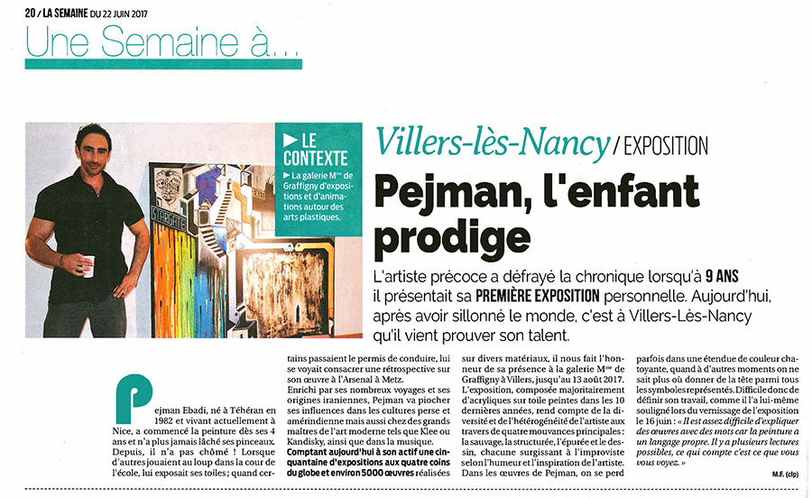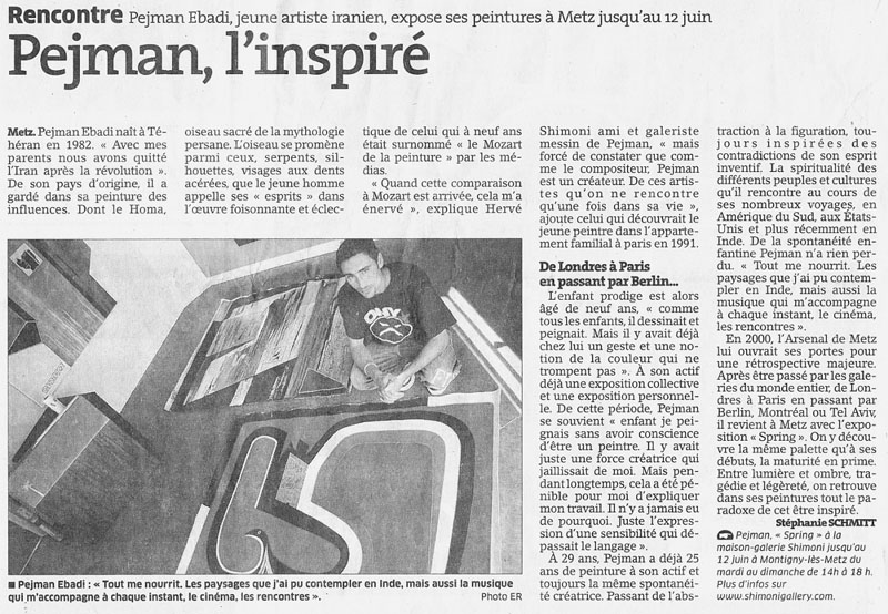 PEJMAN EBADI http://www.artelino.com/articles/pejman_ebadi.asp Pejman Ebadi had his first group exhibition in 1988 in Paris when he was six years old and his first solo gallery exhibition at the age of eight. His works are exhibited all over the world - Montreal, New York, Tahiti, Cannes, Hamburg, Lyon, Bern, Wuppertal and so on and so on. Born in TeheranPejman Ebadi was born in 1982 in Teheran. His family fled from the Ayatollahs to Paris where he grew up. The little boy showed an obvious drawing talent at an age when he was still at nursery school. Since then he has painted incessantly. A Prodigy ChildWhen Pejman was eighteen years old, he had created about 1,500 works of art. The list of his exhibitions has become very long. It looks like the exhibition resume of a middle-aged, internationally successful artist. The young man is fully integrated in his own success. Ebadi is usually present when a new gallery show of his paintings is opened. And it is not only the gallery shows that keep him busy. TV channels such as the main German and French channels report about him. Even Fuji Television Network from Japan or R.F.O from Tahiti broadcast interviews or special coverages of Pejman Ebadi. The hype about the prodigy boy is obvious, but his talent is too. The art works of Pejman reflect the experiences of an adolescent of our times. His images are often violent, aggressive, obtrusive. Others show subtle use of colors and compositions. Astonishing is the great variety and richness of forms, signs, characters and patterns. Pejman's use of color is anything else but arbitrary. The young guy definitely has a great talent. He must be more than the product of a smart art marketing manager. It is the absence of a specific style that shows his real talent. Young stars - no matter whether singers, musicians, actors or painters - often come up with a successful but limited gimmick. They become famous over night, then try to repeat the success again and again and disappear soon, because they are incapable of creating anything else than different variations of one pattern. What Next?Pejman Ebadi's paintings and drawings show elements of all kinds of styles and art movements. Some of his designs look a bit like Joan Miro, other like Picasso or Kandinsky. The young man has not found his style yet. It would be foolish to expect this at his age. And for his development it is better to experience the whole spectrum of modern art styles of the twentieth century. By the time this little article was written (2002), Ebadi has reached the age of twenty. The prodigy child era is over. One can only hope that he survived the hype about his person without taking any damage in his personality and his strive to become a great artist. Might Pejman Ebadi one day become a kind of "Picasso" of the twenty-first century? Only time can tell. His art work sells well. And his paintings and his drawings on paper are still very cheap. They might be worth a fortune in twenty years from now. Speculation should not be the driving force for buying a work of art. But it often is. If you like a work of art and have some prospects it might be something very important and valuable one day - why not. Regard buying an "Ebadi" as Pejman regards painting: a serious play. http://en.wikipedia.org/wiki/User:PhilipASkinner/Pejman_edabi Pejman (pronounced “Payshman”) Ebadi was a child genius. Born in Teheran, he has been painting watercolours of extraordinary depth and sophistication since the age of four. They look like initial sketches from the studios of Paul Klee and Kandinsky. His first solo exhibition was in 1990 when he was eight years old and by the time Ebadi was eighteen years old, he had created around 1,500 works of art. He has no academic artistic training and, rather than using an easel, fixes his supports straight onto the wall or floor. Ebadi’s work expresses the personal views, emotions and experiences of an adolescent absorbing his responses to the world around him. His powerful line drawings often create intense, violent and confrontational images out of a disharmony of colours and a mixture of French and English text. He has had thirty-six solo exhibitions in worldwide venues, including the Villa des Arts in Strasbourg, the Espace Pierre Cardin, Paris, Christian Zeller Gallery, Bern and also in Berlin, Montreal, Toronto, Tahiti, culminating in a Retrospective exhibition at the Arsenal in Metz in 1990. Pejman is now 25 years old. Grosvenor House is the first public showing of a major work by Pejman in Britain.