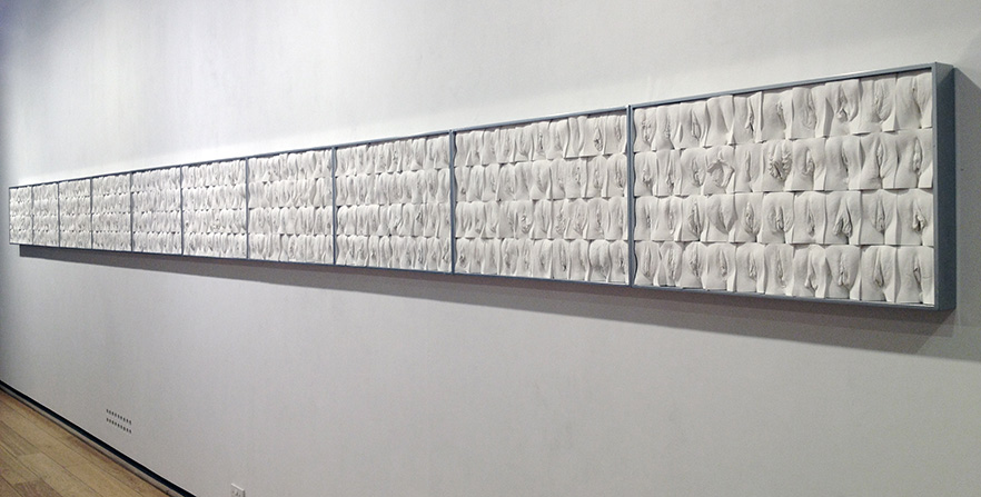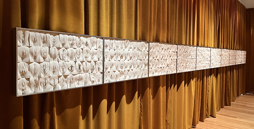 Jamie McCartney’s most famous work was first shown at Hay Hill in 2012. It was the original vulva diversity project that has inspired so many more. Aghast that a male narrative was driving a huge rise in women seeking intimate surgeries, Jamie sought to demonstrate normal genital variety. The 8 metres long wall sculpture consists of four hundred plaster casts of vulvas, all of them unique, arranged into ten large panels. Jamie set out to make this project as broad and inclusive as possible. The age range of the women is from 18 to 76. Included are mothers and daughters, identical twins, trans men and women as well as a woman pre and post natal and another pre and post labiaplasty and many others. Vulvas are as different as faces and many people, particularly women, don’t realise that. Featuring in a growing list of sex-educational texts, it is used by medical professionals the world over to reassure women, alleviate genital anxiety and provide context before turning to cosmetic surgery. The latest fashion for so called designer vaginas could easily reverse one day and favour larger labia. This project has been championed as a powerful antidote to insecurity. Five years in the making and entirely self-funded it typifies Jamie’s determination to produce world-changing socio-political work. It is currently on show in a museum in Lisbon and moves to a museum in Miami later this month.