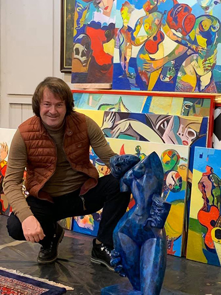 Taming the Chaos Igor Tcholaria calls his artistic method “retro-perspective” (not to be confused with retrospective). In essence, this means that he moves forward in his creative work from the depths of time, mastery and tradition. Like an athlete who steps back to take a running start before jumping. The kinetic energy of this running start can be extremely great. All that remains is to land on one’s feet. Tcholaria feels confident in his flights, even on the quaky ground of contemporary art. He’s resolutely prepared to weed its tangled thickets, accustomed like a true knight to his palette-knife sword and Cubist-form armour. And fairly recently (stepping back to the Bronze Age for his running start?) he turned to what was a new genre for him: bronze sculpture. Combining a classic approach with the vivid forms of sensual improvisations, he managed in a single stroke to create a whole line of original sculptures that have already won popularity in Europe. Tcholaria was born in the town of Ochamchira, Abkhazia, on the Black Sea coast. He received his initial training at the Sukhumi School of Art, where talented pedagogues taught him the basics of the craft and instilled in him a love for painting. Then he continued his education in Leningrad, at the Vera Mukhina School and Academy of Fine Arts. His work is largely influenced by the French Impressionists along with Pablo Picasso, Amedeo Modigliani and Paul Gauguin. Interacting with each other in the artist’s internal crucible, their creative methods were synthesized into a new quality that became the signature Tcholaria style. In addition, he’s spent years experimenting with the texture of the paint layer, striving for a powerful matte finish instead of glossy garishness. During his student years the works of old European masters had an enormous influence on Tcholaria, who spent much time studying and copying them in the State Hermitage and the Old Russian Paintings Department of the Russian Museum. At the same time, he led the life of a typical informal artist, with all the delights and travails of a semi-underground existence. In the mid-1980s Tcholaria was one of the first to begin earning a living drawing portraits of passersby on the street. At that time in the Soviet Union this occupation was not entirely without risk. Once an observant policeman caught him at work in the square in front of Kazan Cathedral. But the vigilant artist noticed the danger in time. Quickly throwing his brushes into his painter’s case, Tcholaria left the girl he was painting to pose in loneliness and disappeared into the cathedral’s colonnade. The law-enforcement officer wandered among the massive columns for a long time to no avail: you can’t catch artists in a maze, for they feel the rhythms of lines better than others. This feeling of rhythm is a manifestation of Tcholaria’s subtle musicality. Whether calibrating combinations of warm and cool tones, like Cézanne, or painting a broken line with a vibrating hand, like Modigliani, the maestro remains invariably himself. He’s on a first-name basis with these great names, whose ghosts quietly hover over his canvases like spirits in a spiritualist séance. Tcholaria’s female portraits are worthy of special mention. His heroines are funny, mysterious, sly and reckless. At times exotic in an Oriental way. At times colourful and monumental. Clearly, the artist does not always require live models. Images constantly flicker through his soul, like evening fireflies in a Black Sea park. Though Tcholaria often deals with the circus theme, he doesn’t depict scenes in the ring; instead, his attention is drawn to the individual characters. Looking at his paintings, one feels the metaphysical longing of Picasso’s harlequins and at the same time their attempt to escape its grip. The artist seems to soothe his protagonists: “You’re colourful and clever. What do you have to be sad about?” One of his works is entitled Look at Me, Look at Me. A harlequin suddenly flies onto the scene and freezes in mid-air. Like a dolphin jumping out of the water. Or a sail floating over the ocean’s surface. Contrasting icily with the dancer are the melancholy girl present in the image and a blue surrealistic figure in the background. This is like counterpoint in music, when a contrasting tonality emphasizes the beauty of the main theme. No wonder the artist repeatedly admits that he prefers working mainly to classical music. He’s especially inspired by Antonio Vivaldi and Johann Sebastian Bach. For Tcholaria, the idea of taming chaos, which he creates on the canvas using an original technique of abstract underpainting, functions as a sort of generator of striking and unpredictable compositions. At first the artist doesn’t restrain his energy in any way. But at a certain moment he suddenly “chokes his own melody” and gazes at the composition like an ancient shepherd at the starry sky, in which not only Big and Little Dippers appear as if on an abstract canvas, but also wild rams, hunting dogs and other phantoms of the imagination. For all its apparent simplicity, this method requires an ideal sense of colour, outstanding plastic abilities and a highly developed intuition, which allow the artist to discern a metaphysical element in random combinations of coloured patches. When Tcholaria first found himself in Europe, it was just this method of spontaneous insight that allowed him to astonish the European public. Throughout the ensuing years the artist developed and improved his trademark technique. Working in this manner, he never knows exactly how the final result will look. And this is the most important thing in art. Surprise yourself, and you’re sure to surprise the viewer. Even God, according to the Bible, couldn’t hide His amazement after creating the Earth. Once Tcholaria became the involuntary coauthor of a hot trend in the fashion industry. John Galliano acquired one of Igor’s painting