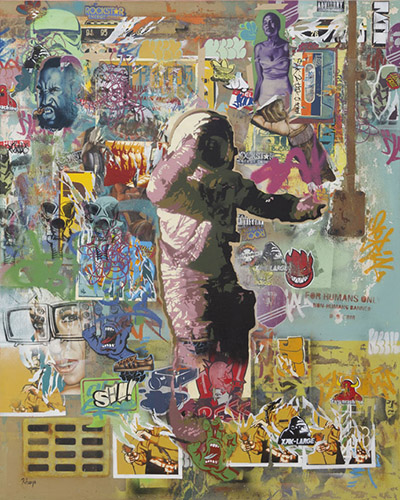 KHAYA WITBOOI Khayalethu Witbooi was born and grew up in Uitenhage in the Eastern Cape province of South Africa. After matriculating in 1995 he did a college course in draughtsmanship and started working as an illustrator for an architectural firm while doing freelance work for The Argus newspaper in Cape Town (court sketches, cartoons etc.) and later painting portraits for interested clients. In June 2010 he was selected to join the Good Hope Artist’s Studio programme where he was given a studio and the opportunity to paint full-time. In December 2011 he was awarded an artist’s residency at the more prestigious Greatmore Studios in Woodstock, Cape Town. He only recently started producing the collage style paintings. This style, inspired by artists ranging from Picasso to Asha Zero, is a style of painting where it appears as if the different images were glued onto the canvas, but were, in fact, all painted and stencilled onto the canvas. Khaya is well-known for his extremely detailed stencilling, watching him work is a chilling experience. Witbooi uses a combination of stencilling and oil painting to express his observations, usually of socio-political nature. The result is edgy and urban with an African relevance. Topics like the seeming failure of democracy to provide solutions to problems related to post-colonial and post-apartheid South Africa, human behaviour in this context and the effects of globalisation are dealt with regularly. It provides valuable insight into a world the viewer seldom had the opportunity to experience first-hand.