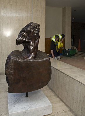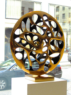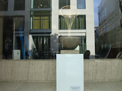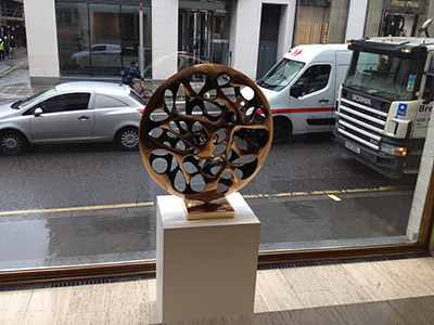 Metaphysics and Moore The Time & Life building is a grade II listed building located on the corner of New Bond Street and Bruton Street in Mayfair. Mounted on the transom above the entrance is a nickel bronze sculpture, 'The Symbol of Community' by Maurice Lambert. The architect Michael Rosenauer often integrated art into his designs, and there are also four Henry Moore sculptures visible around the terrace. Hay Hill Gallery has previously displayed large-scale sculptures in the main window, including Hand Of God by Auguste Rodin, The Horse Head by Unus Safardiar, several sculptures in the co-operation with arTbridge, and recently (July - December 2014) by invitation of ARTful - Gianfranco Meggiato’s golden Tension Disc With Sphere, and then the Pouring Vessel bronze by Roland Piché. The latter takes inspiration from the artist’s fascination with physics and the meaning of reality, leaving a more specific interpretation up to the passer-by. This piece is an optical illusion; perfectly balanced and appearing to defy gravity. About the artists: