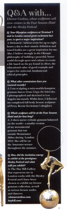 Q & A with ... Q: Your Olympian sculptures at Terminal 5 and in London caused great excitement last year; is sport a major inspiration? A: Definitely! Athletes train for up to eight hours a day so their muscle definition and toned bodies are a great inspiration for me. Also, I believe strongly in the Olympic philosophy of building a peaceful, better world through sport and culture to create a life based on the joy found in effort, the educational value of good example and respect for universal, fundamental ethical principles. Q: What other commissions have you received recently? A: I am sculpting a twice-world-champion gymnast dancer from Cirque Du Soleil who I photographed and sketched in Los Angeles last month. While there, I delivered my completed full body, bronze sculpture of Petra, Bernie Ecclestone's daughter. Q: Which sculpture will be at the Four Seasons Hotel and for how long? A: A three-metre rhythmic gymnast balanced on the world - a smaller version of my monumental gymnast that was outside Westminster Abbey during London 2012. She will be on the Amaranto terrace throughout the summer. Q: How did the invitation emerge to exhibit at the prestigious Henley Festival and what will you exhibit? A: The Hay Hill Gallery that represents me in London works with the Henley Festival and I have been chosen to exhibit my bronze gymnast collection, as well as various bronze nudes and dancers. |