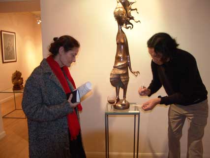 ONCE again Hay Hill Gallery has brought to London the delights of Russian Art with this stunning exhibition of Dashi Namdakov sculptor and alchemist. Namdakov's lyrical and liquid figures cast in bronze and silver conjure the vast expansiveness and mystery of Russia's non-western plainsmen and indigenous people. Dashi Namdakov, born in 1967, lives in the South Eastern part of Russian Siberia, in the Chita region, near the Russian-Chinese border in a small Buryati village near the world's cleanest and biggest fresh water container, Lake Baikal. His father was a well-known village craftsman with versatile talents, making things by hand, furniture, metal handles, carpets and wood-carved sculptures. Working At 18 Dashi moved to Ulan-Ude, Buryati's central city, and started working with the well-known sculptor Gennady Vasilyev. Two years later he entered the University of Fine Arts in Siberia's Krasnoyarsk City, where famous Russian artists Lev Golovnitsky, Yuri Ishkhanov, Azat Boyarlin and Eduard Paklhomov taught his academic art. Dashi Namdakov has been nicknamed the alchemist, observing the beauty of the natural world around him and recreating it in metal. His roots take in both the ancient traditions and the modern history of his country and culture. You find in his sculpture a mix of traditional images of remote Mongolian steppe civilisation from Central Asia - its warriors and beauties, its shamans, totemic animals and mythological creatures. His creations delight the eye and the imagination, making us believe in the reality of story telling. His pieces are strongly influenced by the oriental culture of the east where man and the universe are united, and where everything is an integral part of the ‘universal construction’, and yet he was influenced by Michelangelo. Breugel and Japanese art. Namdakov himself says: 'From my village to New York, I do not have words to describe the distance.' But his technique and craftsmanship, his knowledge of contemporary and modern art forms, testily also to the unifying process of the Soviet workers' revolution of October 1917, which liberated the peasant from ignorance and brought education, art and literature to the remote parts of the region. A revolution which made it possible for a young 'peasant lad' from the remotest inhabited regions to develop and train in the leading Art School in Siberia and to show his art in the State Hermitage, the State Museum of Oriental Art, and the Russian Museum of Modern Art. Dashi Namdakov transforms metal into silky creatures with a liquid and lyrical movement, imagined figures are made extremely tactile. His creatures have a tremendous energy and a magical power to awe, but with a lightness and humour, which delights the eyes and tickles the mind. Warriors and archers feature in Namdakov's work, broad and powerful and yet whimsical and mystified, pitted against a more powerful and mysterious natural world. For the artist, the concepts of a warrior and a sage were one. There are many horses in Dashi's work, reflecting the life of the Mongolian herdsman. In one Chinese legend a Stallion falls in love with his Master's daughter and was shot with an arrow for his troubles. But the Stallion’s skin wraps up the girl and carries her into the steppe where she is transformed into a a strange creature – a huge mulberry silkworm with a horse head, becoming the Goddess of silk-spinning. There is the delightful work called, The Rich Fiancee, in which a young woman riding a stylish mule, laden with a small travel trunk, twists on the horse, looking back at a crowd perhaps as she commences her journey. The ass she rides twists its neck 180 degrees to face the rider, but its eye looks out at the viewers, to bring them into the joke. The Pearl depicts a young woman balanced lightly on a plinth, toes curling upward and skirt blowing round her knees, her head turned away, and in her hand a large pearl. This was cast in three different colours of bronze, highlighting and shadowing and giving the sculpture a depth of texture. The Steppe Nefertiti is the head of a Mongolian woman in the style of the famous Egyptian queen. She is beautiful and peaceful and calm. Dashi prefers to work in bronze as the most visually expressive material. But he has used other materials and techniques. Two of his pieces The Bet and Raven-bird are made of felt and horsehair. Not exhibited but seen in the catalogue. Also featuring in this small friendly gallery hanging above his sculptures are Namdakov's giclee prints of his warriors. This is a new printing technique developed in France where pencil drawings can be projected onto canvas. Dashi creates his own mythology. He re-organises anthropomorphic features and invents fantastic bodies. She-Guardian is a sabre-toothed, winged, wonderful, mythical gargoyle-like creature with eight milk-full teats prancing on claws, staring wide-eyed and warning anyone who comes near. Suggesting the power of nature and of human sexuality, his erotic He and She of redwood and bronze are facing each other - two statues with the heads of gazelles and human bodies, one with women's breasts and six teats, the other with a full erection. The sculptor said: 'Each thing or idea has its own inner logic which dictates the form of expression ... by understanding and following the logic one creates a wholeness out of details.' This is a delightful exhibition and well worth a visit to this friendly gallery.