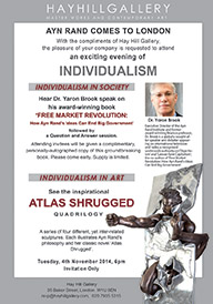 4 November 2014 - Speach of Dr Yaron Brook on his book 'Free Market Revolution: How Ayn Rand's Ideas Can End Big Government' and exhibition of Atlas Shrugged sculpture quadrilogy by Richard L. Minns illustrating Ayn Rand's philosophy and her classic novel 'Atlas Shrugged'.
