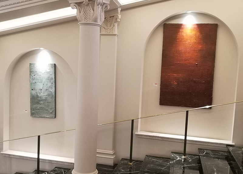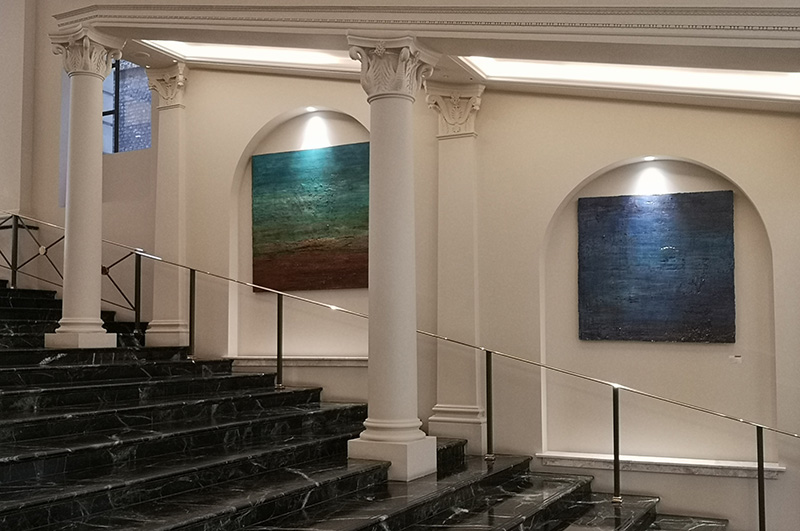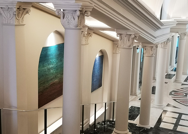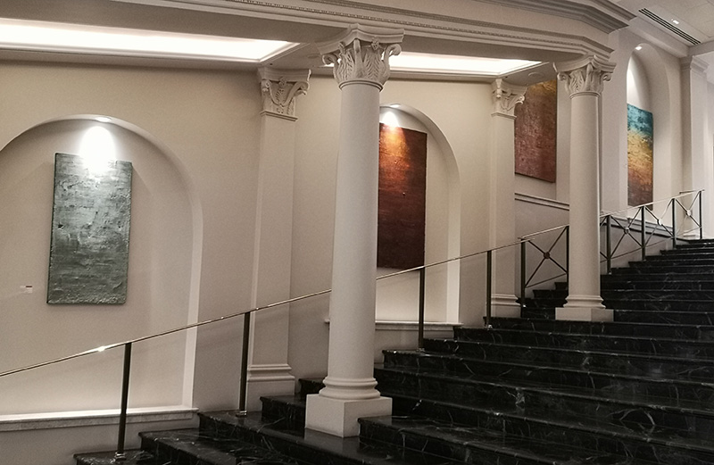 The floors in all the main public areas are in elaborately-patterned marble, echoing motifs from St Peter's and other Roman churches by Bernini. Bands of Estremoz marble frame the patterned areas and help define the architectural and structural grid. The radical design of the Compass Hall revolves around a central sun/compass which highlights the new orientation of the building at this point and directs visitors to the main stairway and the South Gallery. Magnificent stairway inspired by a Bernini original in the Vatican, it leads to the entrance Atrium on the main floor of the Gallery. The marble steps with their carefully-measured height rise between freestanding columns and walls decorated with niches on either side. The Stairway broadens out invitingly as it descends and leads to a hall dominated by succeeding arches accessing the lifts to the north, and then, to the right, runs through the Gallery with its sky-lighted six floors.