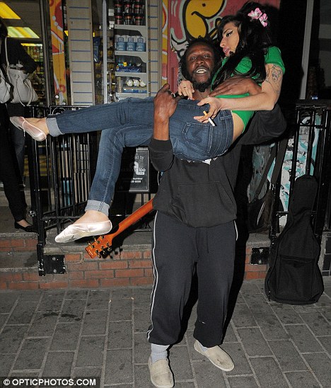 In a low cut black dress which highlighted her enhanced cleavage and her favourite ballet shoes, Amy was accompanied by goddaughter Dionne Bromfield at the Hayhill gallery for the occasion. Amy and Mitch performed September In The Rain and Fly Me To The Moon at the event in honour of human rights lawyer Julian Young. Mitch, a former London taxi driver, decided to pursue a singing career after seeing the success of his daughter. After spending months recording, his album Rush of Love, which contains covers as well as some of his own original songs, is due for release on June 7. But the night had clearly finished too early for Amy, who then changed into a more casual outfit of a green polo t-shirt and jeans for a trip to Camden. After a quick stop in The Good Mixer pub, Amy and her friend Tyler James then headed on to favourite drinking hole The Hawley Arms where they stayed until 11.30pm before returning home. As they walked down the road to get a car home, Amy started talking to one over-eager fan who insisted on picking her up, before kissing her.