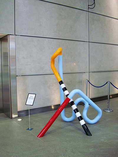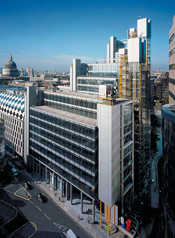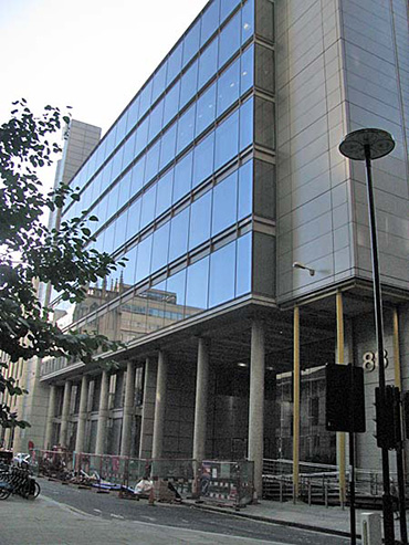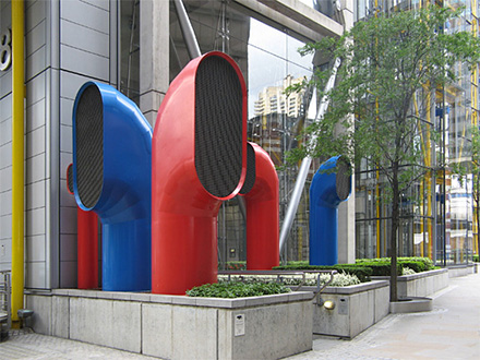 88 Wood Street is a commercial skyscraper in London, located on Wood Street in the City of London. The architect was the Richard Rogers Partnership (RRP), now known as Rogers Stirk Harbour + Partners. The building was constructed between 1993 and 2001. The 18-storey structure has an office space of 33,000 m2 In 1990, following a limited design competition, RRP was commissioned by Daiwa Europe Properties to design their new London headquarters on a site at the corner of Wood Street and London Wall. The twin economic recessions that hit Europe and the Far East, however, obliged Daiwa to rethink its strategy and the prestigious headquarters project was abandoned. The site stood vacant for three years, after which a new brief was given to RRP to design a speculative, high-quality, commercially lettable building, larger and more economical than its predecessor. The site lies at the heart of the City of London, between St Paul's Cathedral and Moorgate. It previously housed two telephone exchange buildings, one of which had been spot-listed prior to the commencement of the works. The building was subsequently de-listed and demolished along with a 1960s office building. Within the existing basement, however, was a fully functioning British Telecom exchange chamber, which was required to remain in operation during demolition, construction and occupation of the new building. Eighty-eight Wood Street is adjacent to the tower of the Grade I listed St Alban's Church, designed by Sir Christopher Wren (the remainder of the church was destroyed during World War II). In addition, the site is bounded by two historic churchyards; St Mary's to the south and St Olaves to the west (the latter destroyed in the Great Fire of London) . Surrounding the site are various contemporary buildings ranging in height from four to 23 storeys. Planning permission was granted for the initial headquarters scheme in 1992. The development was the subject of protracted and complex planning negotiations with the Corporation of London planning department especially in relation to viewing corridors from the South Bank, St Paul's Cathedral and the Barbican terrace. In order to avoid resubmitting a new application, the development envelope established by the initial application was adhered to for the second design, despite the requirement for more floor space. The 33,000 square meter building is arranged as three linked blocks of office accommodation that step up from eight storeys on Wood Street, where the context includes two listed buildings, to fourteen and finally eighteen storeys to the west, responding to the taller built topography towards London Wall. By using the extensive basement of the demolished telephone exchange for plant, roof levels were kept largely free. The office wings are constructed of in situ concrete which contrasts with the lightweight, steel-framed service towers containing toilets, lifts and dramatic, fully glazed stairs. The use of brilliant colour enhances their impact - air intakes and extracts at street level are also brightly coloured, contrasting with the neutrality of the occupied floors. The generosity of the scheme is reflected in the spacious, 8 metre-high entrance lobby, floored in granite as an extension of the external landscaping. This reception area features a 54 metre-long wall running the length of the building. The facades of the main office floors are glazed from floor to ceiling to maximise daylight and views - in addition, levels 8, 12 and 16 lead directly onto roof terraces with spectacular views over the city skyline. Hay Hill Gallery is collaborating with ARTful Ltd, exhibiting contemporary sculpture at the entrance hall of 88 Wood Street business centre. Featured Artist: Sam Shendi’s works references the work of “minimalism”, the style of paring-down design elements and focusing on the medium of steel, aluminum and paint. Some of his works are deceptively simple in form but include the qualities of metaphorical associations, symbolism and suggestions of spiritual transcendence.