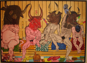 I can see why Estavillo has been called the “Pop – Brueghel” and “Tarantino of Painting”. He exposes the dark side of life in a very visually appealing way embodying a pulp-fiction sentiment that takes the image one step beyond ‘real life’ although all his characters are drawn from people he knows. I was also taken by his painting ‘Minotaur’s Sauna’ not that I’d hang it on my living room wall or anything but it did catch my attention for rather a long time…