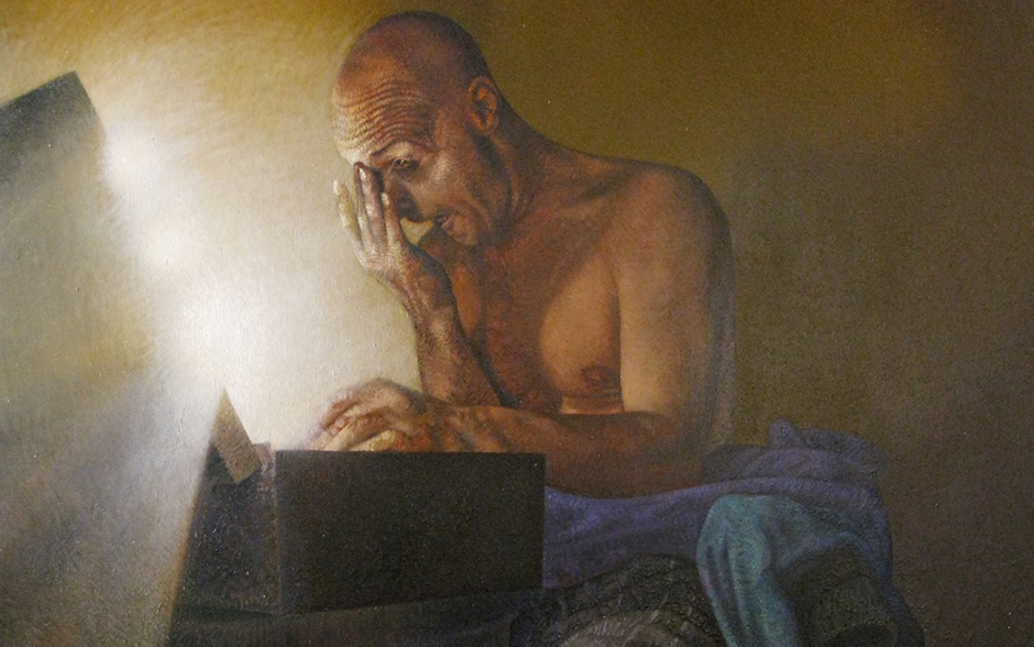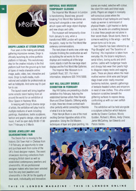 HAY HILL GALLERY DOUBLE EXHIBITION IN FEBRUARY Hay Hill Gallery are presenting a double exhibition this February, featuring the established German artists Peter Henryk Blum and Oliver Estavillo. Differing wildly in style, these two shows contrast each other perfectly whilst connecting in theories of what it is to be human.Peter Henryk Blum is one of the most exciting German figurative artists of his generation. Using the Old Masters techniques of layer and glaze painting, his scenes are muted, selective with colour, like silent film reels and tinted sepia prints. Players are staged in ironically self-conscious poses where the melancholia of sad harlequins and heavily made up women is reminiscent of physical theatre. Light hearted or darkly surreal, the works are unsettling because it is clear these people are not alone in their secret rituals. Struck dumb, there is someone watching in the wings - and that person turns out to be you. Oliver Estavillo has been referred to as 'Pop-Brueghel' and 'The Tarantino of Painting'. His inspiration is taken from everyday life; the bizarre neighbours, serial killers, boring aunts and shrill parties. Ladies with budgerigar heads and droopy hats wear their pearls high to disguise crepey necks and sagging jowls. These are places where the meat-mottled women drink wine and fanged stags brawl under neatly mounted taxidermy testicles, operatic gatherings of tentacle-headed lurkers and emperors in need of new clothes. This ultra-violent fantasism scratches beneath the glittering surfaces to expose decay, confronting us with our own selfish bloodlust. The exhibition will be held alongside a sculpture collection which features works by Eleanor Cardozo, Nicola Godden, Richard L.Minns, Andy Cheese, Jamie McCartney, Ian Edwards and Palolo Valdes.Marylebone Journal, February/March 2014