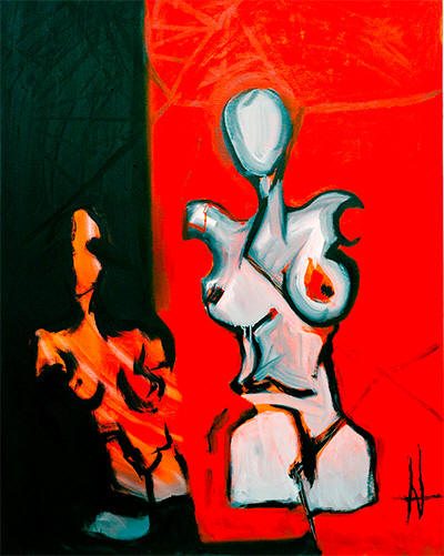 Natália Gromicho’s work is often concerned with perception and reality. Her canvases are as energetic as the Lisbon streets with desiccating slogans and sunset red riots, and it is easy to see the personal influence of this bright chaotic city. Painted lines scrawl over deserted pastel buildings, the ubiquitous graffiti contrasting with the multiple layers. Gromicho controls temperature and atmosphere as though adjusting a thermostat or volume button. The dialled tones range across canvas from cool-eyed blues to fiery madder hues. Her highly pigmented glazes gloss over boundaries between figures and abstractions, creating a shift in focus and scale. The use of wet and dry brushwork adds to the subtle variations in mood- shiny as slick taillights in the rain, as grubby as the exhaust fumes that blacken the puddles. The recurring image of a headless and armless female mannequin verges on the surreal, and within this metaphysical framework Gromicho paints with an anything-might-happen wildness. Her paintings are slowly piecing together a philosophical mosaic- and with more and more in demand, her unique vision only gets clearer.