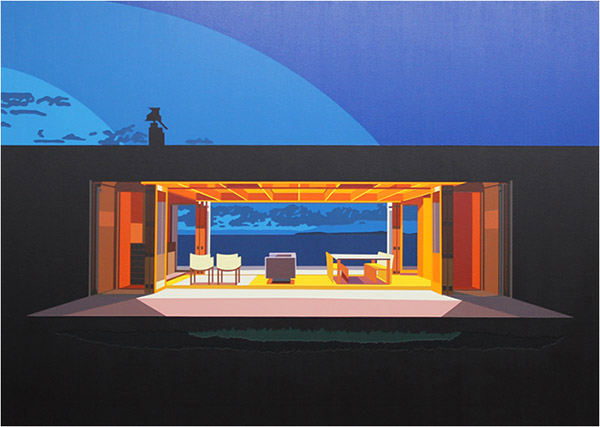 Martyr’s ‘Stay Until Tomorrow’ is a romantic take on his usual clean, modernist style. The new compositions allow a sense of voyeuristic excitement, facilitated by the fact that there are no figures present. These utopian views conjure a timeless elegance and nostalgia, as Martyr marries together found images with remembered places. We find that these familiar settings are soft-focus templates for the mnemonic, at once heightening and embellishing reality. Immensely popular, the works offer the ideal combination of stylish aesthetic, soulful contemplation and technical brilliance.