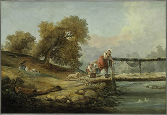 Hubert Robert (22 May 1733 – 15 April 1808), was a French painter, noted for his landscape paintings and picturesque depictions of ruins. Hubert Robert was born in Paris in 1733. His father, Nicolas Robert, was in the service of François-Joseph de Choiseul, marquis de Stainville a leading diplomat from Lorraine. Young Robert finished his studies with the Jesuits at the Collège de Navarre in 1751 and entered the atelier of the sculptor Michel-Ange Slodtz who taught him design and perspective but encouraged him to turn to painting. In 1754 he left for Rome in the train of Étienne-François de Choiseul, son of his father's employer, who had been named French ambassador and would become a Secretary of State for Foreign Affairs to Louis XV in 1758. He spent fully eleven years in Rome, a remarkable length of time; after the young artist's official residence at the French Academy in Rome ran out, he supported himself by works he produced for visiting connoisseurs like the abbé de Saint-Non, who took Robert to Naples in April 1760 to visit the ruins of Pompeii. The marquis de Marigny, director of the Bâtiments du Roi kept abreast of his development in correspondence with Natoire, director of the French Academy, who urged the pensionnaires to sketch out-of-doors, from nature: Robert needed no urging; drawings from his sketchbooks document his travels: Villa d'Este, Caprarola. His success on his return to Paris in 1765 was rapid: the following year he was received by the Académie royale de peinture et de sculpture, with a Roman capriccio, The Port of Rome, ornamented with different Monuments of Architecture, Ancient and Modern. Robert's first exhibition at the Salon of 1767 was greeted in print by Denis Diderot, "The ideas which the ruins awake in me are grand." He was successively appointed "Designer of the King's Gardens", Keeper of the King's Pictures" and "Keeper of the Museum and Councillor to the Academy". Robert was arrested in October 1793, during the French Revolution. He survived his detentions at Sainte-Pélagie and Saint-Lazare by painting vignettes of prison life on plates before he was freed at the fall of Robespierre. Robert narrowly escaped the guillotine when through error another prisoner died in his place. Robert died of a stroke on 15 April 1808. From Wikipedia |