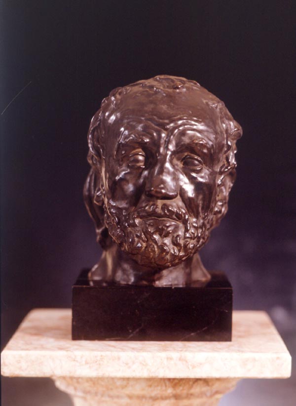 In her introduction to the catalogue Metamorphoses in Nineteenth-Century Sculpture, which accompanied an exhibition held at the Fogg Art Museum from November 1975 to January 1976, Jeanne L. Wassermann discussed this mask: The richness of American collections in Rodin sculpture has allowed us to assemble some fifteen casts of The Man with the Broken Nose. One of our most dramatic moments occurred when we first observed this assemblage lined up on a counter in the Fogg’s Objects Conservation Laboratory. Only then did we recognize the variety of the mounting angles represented by the different editions and the effect these had, not only on the height measurements, but on the expressive impact of the portrait itself. Change in the tilt of the head, which was quite possibly a decision made by the foundry and not the sculptor, expands the range of mood conveyed by this portrait of "Bibi" from a lively characterization to one of tragedy, deep contemplation, or sophisticated worldliness. Early in his career, in late 1862 or early 1863, while making decorative sculpture and working as an apprentice to conventional sculptors, Rodin created The Man with the Broken Nose, a work that he would refer to as "the first good piece of modelling I ever did." |